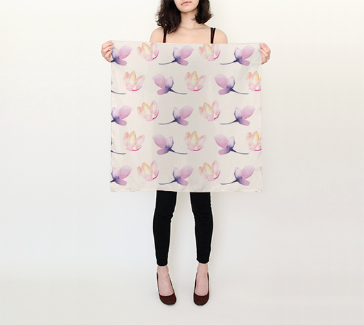 Printed on 100% silk and finished into a lovely 26" x 26" square scarf. Choose from our different silks; silk habotai, silk chiffon, silk charmeuse and polychiffon. Machined baby rolled edge hem finish.